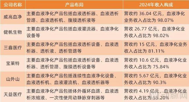 目前,国内血液净化行业已有多家上市公司,如健帆生物、山外山、宝莱特、天益医疗等。这些企业在血液净化领域均布局了“设备+耗材+透析液”,不过各企业的主要产品及产品侧重略有差异。