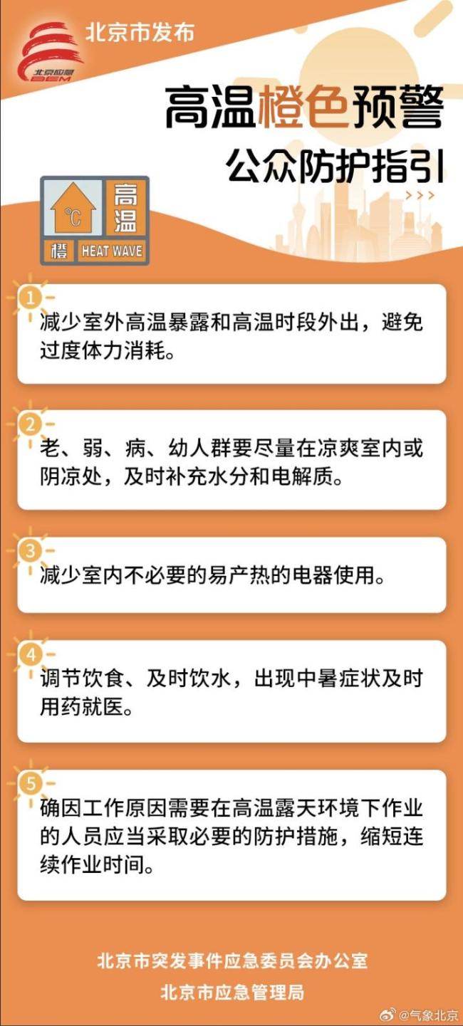 6月4日18时,北京市发布高温橙色预警。预计6月5日12时至18时,北京平原大部分地区最高气温将达到37℃或以上,请注意防范。