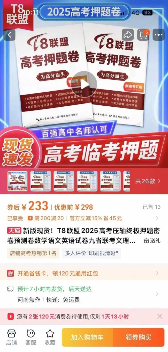 北京商报记者在电商平台看到“T8联盟2025高考压轴终极押题密卷”,券后价高达233元;“小禾同学2025高考押题卷”,券后价为83.3元。这些商品无一例外都在标题中突出“精准押题”概念,以“名师辅导”为噱头,吸引考生和家长的目光。