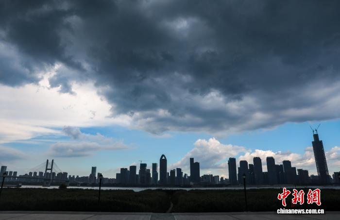 图为武汉城市上空蓝天与乌云同现,宛如大自然绘就的“阴晴交界图”。中新社记者 张畅 摄