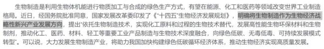 政策层面,国家对于生物制造的支持已经持续了多年。2022年,国家发改委印发《“十四五”生物经济发展规划》,将生物制造定位为生物经济战略新兴产业发展方向。