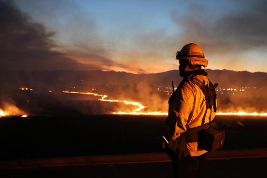 1月22日,在美国加利福尼亚州洛杉矶县卡斯泰克市的一座山丘上,消防员观察山火“休斯”的动向。新华社发(邱晨摄)