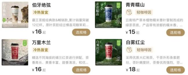 如今的奶茶名五花八门,既有花样繁复的抽象名称,也不乏简洁明了的名字。例如霸王茶姬原叶鲜奶茶系列的名字国风味十足,如伯牙绝弦、青青糯山、万里木兰等,但仅从名字上看,并不能看出口味和配料的不同。除了原叶鲜奶茶,霸王茶姬的远山鲜沏篇饮品名字也带有浓厚的古典韵味,如万象春、花田坞、醒春山等,初看令人困惑。