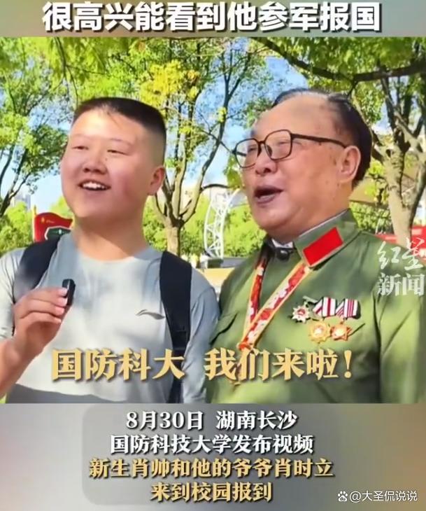一等功臣带着孙子到国防科大报到 薪火相传续写传奇!8月30日,国防科技大学长沙校区三号院南门,一场跨越半个世纪的军旅接力在此定格。87岁的肖时立老人颤抖着抚摸胸前八枚军功章,身旁18岁的孙子肖帅正接过录取通知书。这对祖孙用行动诠释:英雄精神从未远离,它正以代码、芯片和量子通信的方式,在年轻一代手中续写新的传奇。
