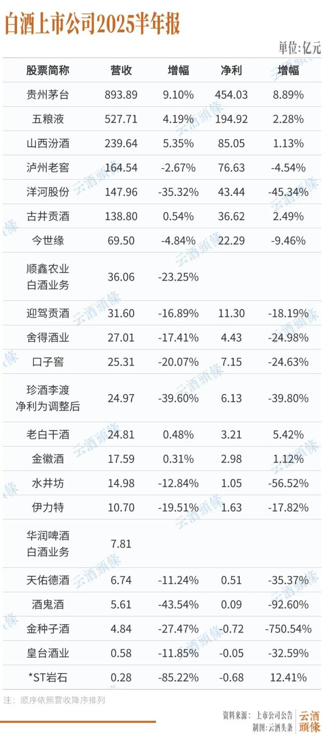 中国酒业协会数据显示,2025年1-6月份,白酒规上企业数量为887家,与去年同期减少了100多家,规上企业数量进一步减少;白酒产业产量完成191.59万千升,同比下降5.8%;销售收入3304.2亿元,同比微增0.19%;利润实现了876.87亿元,比去年下降10.93%。