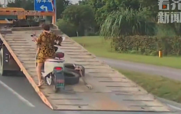 女子骑电动车冲上路边拖车 拖车:公主请上车