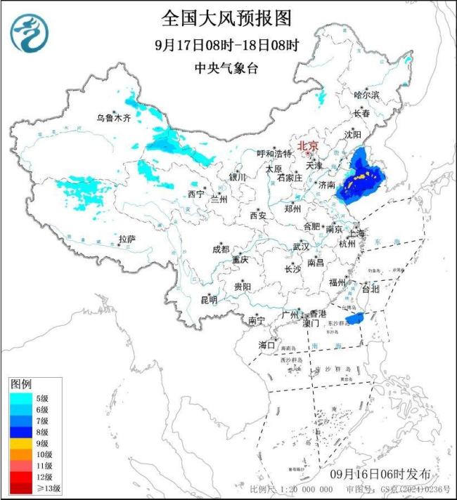 9月17日8时至18日8时,新疆东部、甘肃河西、青海北部、西藏北部等地部分地区将有5级、阵风6级的大风。其中,甘肃河西等地局地风力可达7级、阵风8级。黄海大部海域将有7~8级、阵风9级的大风,黄海中部的部分海域风力可达9级、阵风10级。