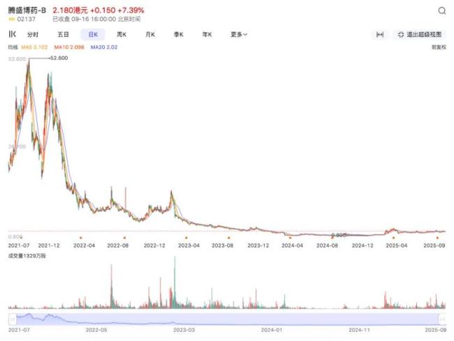 腾盛博药上市后曾最高至52.60港元,后一度跌至1.13港元,较发行价下跌94.92%。如今也在2港元/股附近徘徊。