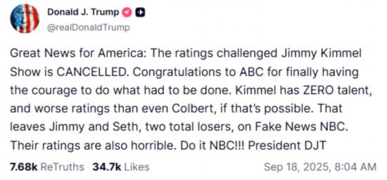 特朗普17日在社交媒体平台“真实社交”上对ABC的停播决定表示肯定:“这对美国来说是个好消息。祝贺ABC终于鼓起勇气做了该做的事”。他同时抨击美国全国广播公司(NBC)脱口秀节目主持人吉米·法伦和塞思·迈耶斯。