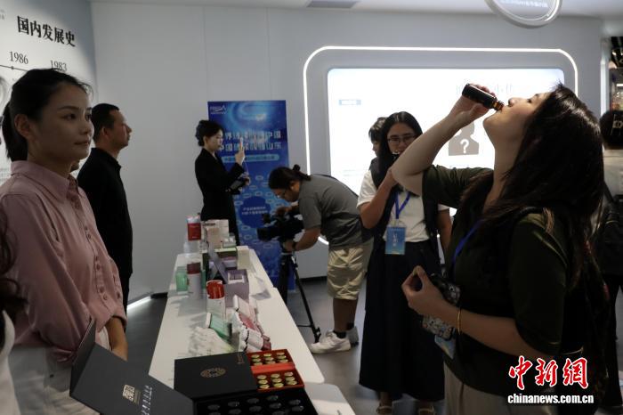 9月17日至19日,国务院新闻办公室组织30余名记者赴山东省采访推进黄河流域生态保护和高质量发展情况。图为,记者在山东福瑞达生物体验功能饮品。李欣 摄