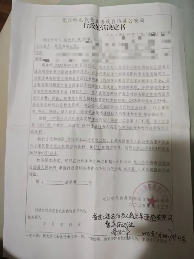 高光华因在微信朋友圈评论县教体局长李文刚被免职一事,被云南玉溪市元江县公安局处以行政拘留四日的处罚。他认为这一决定认定事实不清、证据不足,适用法律错误,违反法定程序,明显不当,将正常的公众监督视为违法犯罪,并于9月17日申请了行政复议。