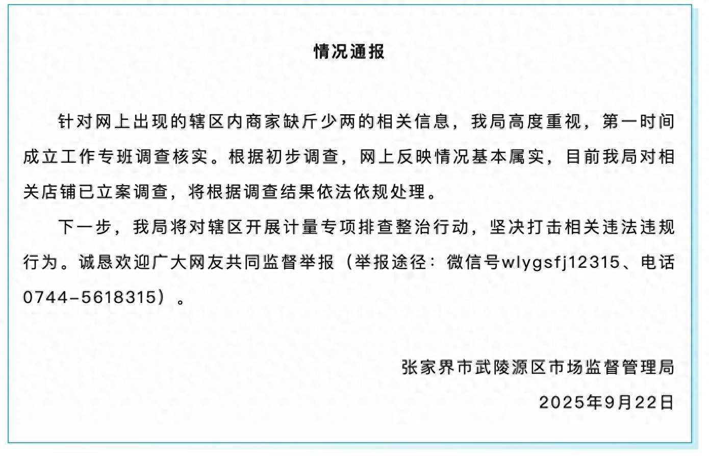 针对网上出现的辖区内商家缺斤少两的相关信息,我局高度重视,第一时间成立工作专班调查核实。根据初步调查,网上反映情况基本属实,目前我局对相关店铺已立案调查,将根据调查结果依法依规处理。