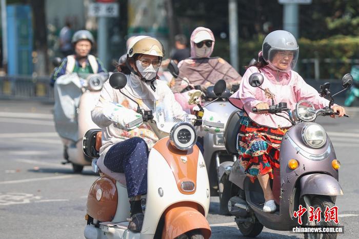 10月11日,江西南昌,民众身穿防晒衣戴帽子出行。中新社记者 刘力鑫 摄