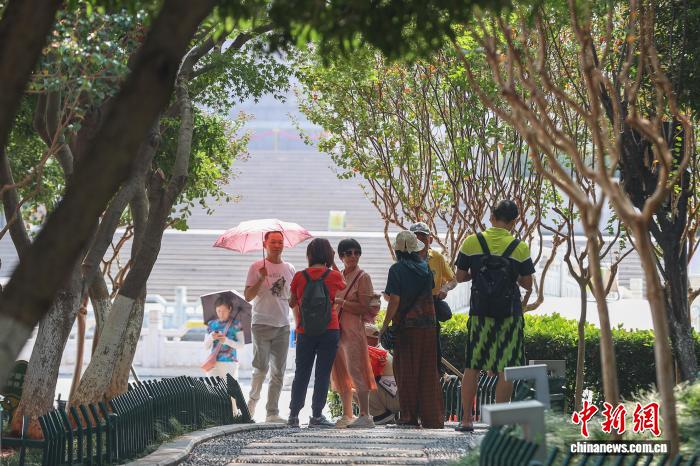 10月11日,江西南昌,民众在八一广场的树荫下乘凉。中新社记者 刘力鑫 摄