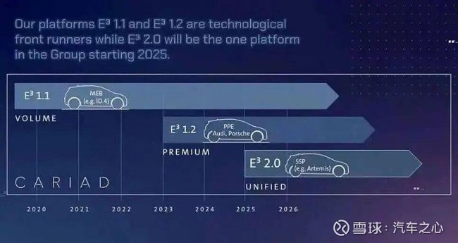 MEB平台的电子电气架构为E31.1,PPE 平台 E3 1.2,下一代统一式的 SSP 平台是 E3 2.0,支持 L4 级自动驾驶。