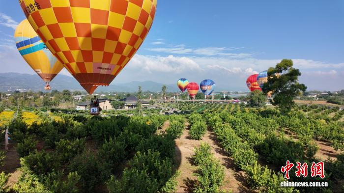 图为五彩斑斓的热气球缓缓升空,漂浮在金堂县万亩橘园上。杨予頔 摄