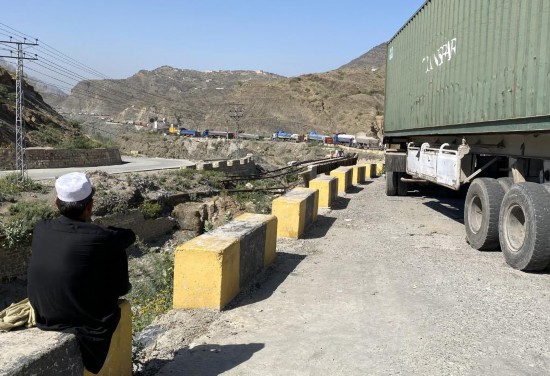 10月13日,在巴基斯坦与阿富汗的边境口岸多尔哈姆,卡车因边境地区冲突而滞留。新华社发