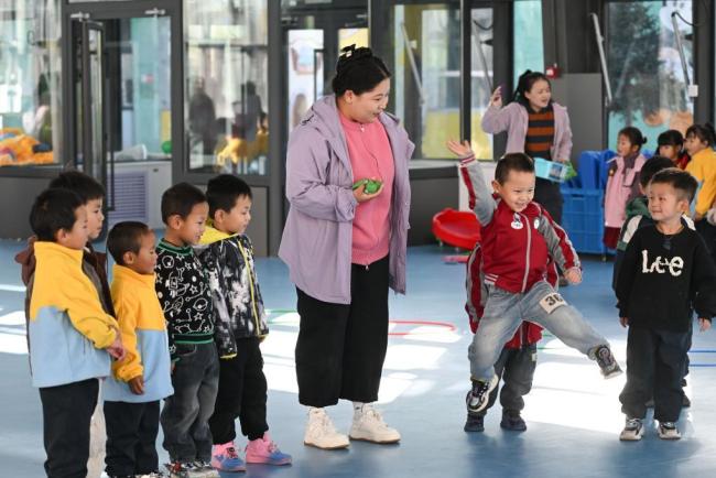 在青海天峻县民族幼儿园,小朋友们在老师的带领下上体育课。今年秋季学期,逐步推行免费学前教育惠及约1200万人;全国残疾儿童义务教育入学率达到97%;加大对教育基础薄弱地区县中的投入支持力度。这些措施使得教育公共服务更加普惠和优质,教育改革发展成果更多地惠及人民。