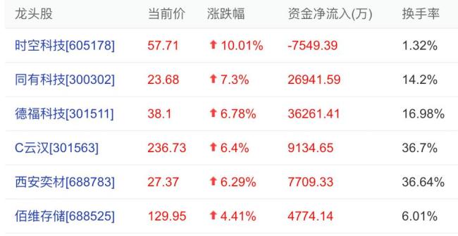 10月29日,存储芯片板块表现强劲,时空科技涨停并连续六个交易日上涨,同有科技涨幅超过7%,德福科技、云汉芯城、西安奕材和佰维存储等公司股价也纷纷上扬。