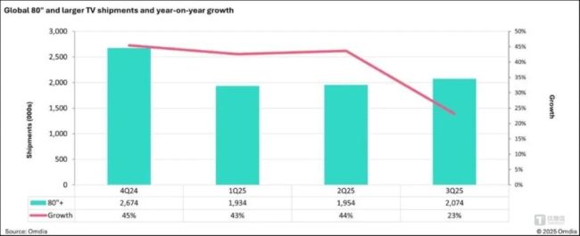 而中国市场的下滑也间接影响了全球市场的走势,数据显示,三季度全球电视机出货量同比小幅下降至5250万台。中国市场的放缓也影响了80英寸及以上超大尺寸电视的增长速度,增速从过去的40%骤降至仅23.1%。在市场大盘衰退的背景下,洛图科技(RUNTO)也下修了2025年全年泛百寸电视的出货量至76万台,Mini LED电视的预测销量从年初的千万台下调至802万台。