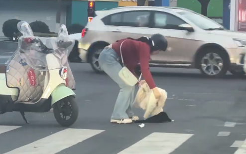 近日,江苏常州。一只受伤的小猫在车流中艰难爬行,路过的小姐姐果断脱下外套,轻轻将它裹住,抱进怀里。谢谢你的善良与温柔,为这份守护点赞!