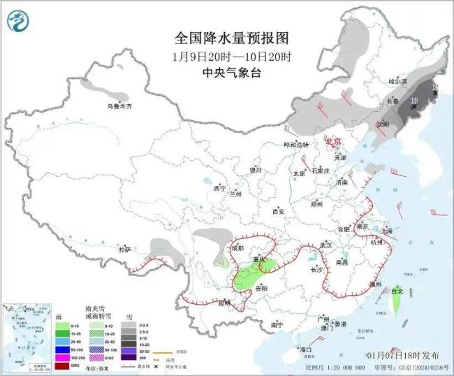 具体预报如下:1月7日20时至8日20时,内蒙古东北部、黑龙江、新疆北部高海拔山区、西藏东部、青海东南部、川西高原北部、贵州西北部、云南东北部等地部分地区有小到中雪或雨夹雪。四川南部、贵州西南部、云南中东部和西南部、台湾岛东部等地部分地区有小雨。内蒙古中西部、新疆北部和东部、辽东半岛、山东半岛等地部分地区有4~6级风,阵风7~8级。南海西南部海域将有7~8级、阵风9级的东北风。
