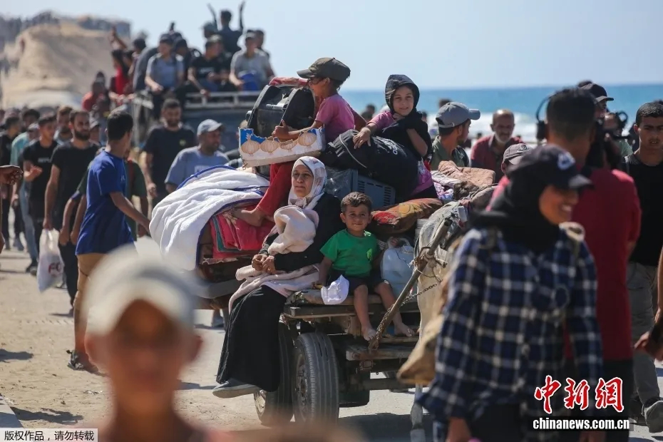 资料图:巴勒斯坦民众从加沙地带中部的努塞拉特向加沙城行进。