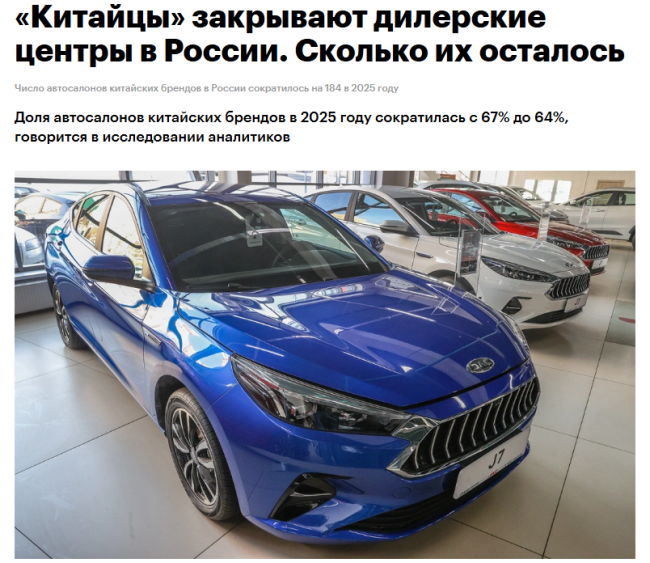 据俄罗斯媒体1月21日报道,到2025年,俄罗斯天然气工业银行汽车租赁公司发布的一份研究报告显示,俄罗斯汽车经销商总数将减少至4076家。其中,中国品牌汽车市场的变化最为显著:其市场份额从67%下降至64%。据统计,到2025年,俄罗斯中国品牌展厅有643家选择关闭。截至年底,俄罗斯境内共有2599家中国品牌展厅。