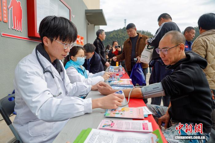 2月12日,一场接地气、有温度的迎新春“村晚”在福建省顺昌县高阳乡幸福里社区操场热闹开演。村民自编自导自演,歌舞、小品等节目轮番登场,用质朴表演展现乡村新风貌,现场掌声不断、欢声笑语洋溢。活动同步开展写春联、义剪、健康体检等便民服务。图为“村晚”活动期间组织的义诊。朱城铖 摄