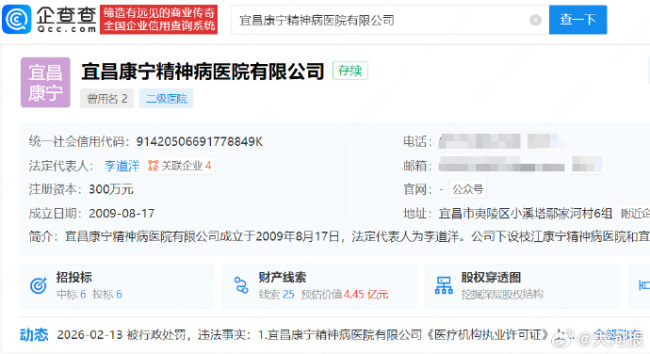 近日,记者从企查查平台了解到,宜昌康宁精神病医院有限公司因未按规定制定和实施医疗质量安全管理制度等被宜昌市夷陵区综合行政执法局警告并处罚款1万元。