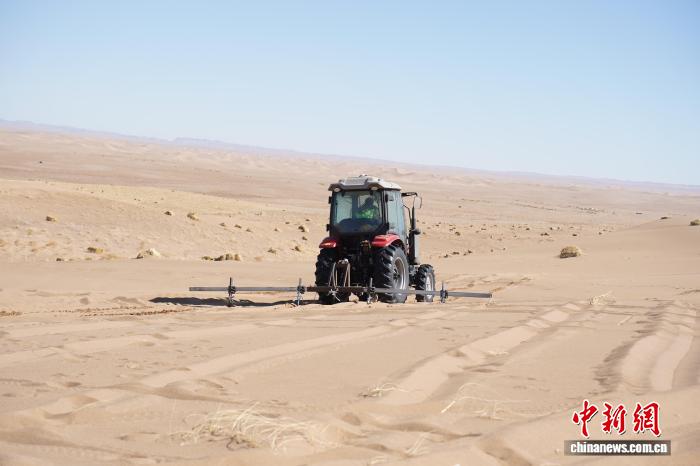 图为工人驾驶机器进行草方格划线。侯旭佳 摄
