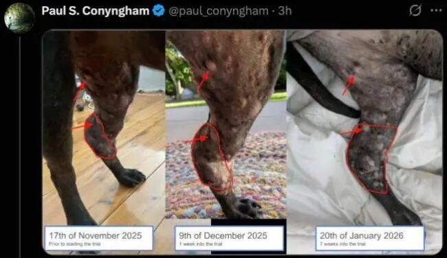 2025年12月,罗茜接受了第一针注射。一个月后,效果显著,主要肿瘤明显缩小。这只曾经奄奄一息的狗又开始活蹦乱跳地追兔子了。