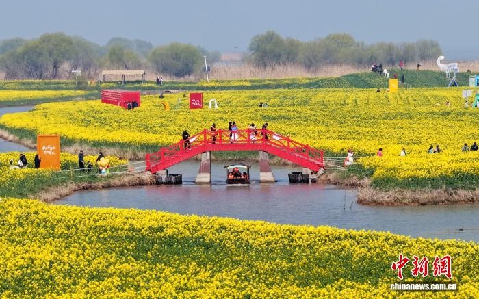 中新网扬州3月20日电 (徐珊珊 崔佳明)一湖春色,万顷花香。3月20日,2026“苏韵乡情”乡村休闲旅游扬州专场推介暨高邮市第九届湖上花海文化旅游季在高邮湖上花海景区启动。千亩油菜花竞相绽放,金黄的花田与万顷碧波交相辉映,构成一幅“黄金铺地接云海,碧水连天入画廊”的春日胜景,吸引八方游客共赴这场春天的约会。