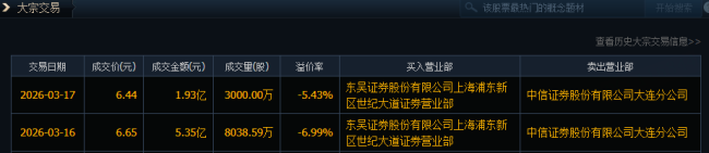 据大宗交易数据,3月16日至17日,南山铝业大宗交易卖方均为中信证券大连分公司,买方均为东吴证券上海浦东新区世纪大道营业部。3月16日成交8038.59万股,成交金额5.35亿元;3月17日成交3000万股,成交金额1.93亿元。以此计算,怡力电业本次减持套现超7.2亿元。