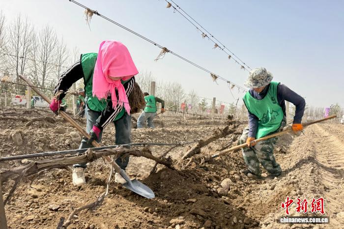 4月3日,宁夏贺兰山下沃尔丰酒庄,农户现场进行展藤工作并参加展藤劳动技能竞赛。中新社记者 李佩珊 摄