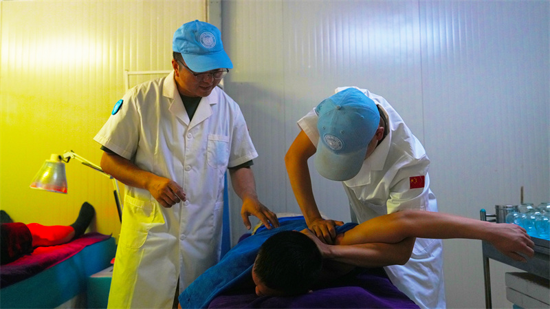 中国第六批赴阿卜耶伊维和直升机分队官兵进行中医理疗,图为官兵康复推拿。黄浩摄