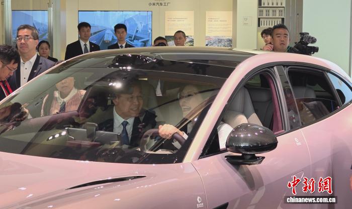 4月12日,中国国民党主席郑丽文一行,在北京参观小米汽车工厂。郑丽文(右)受邀上车体验。中新社记者 路梅 摄