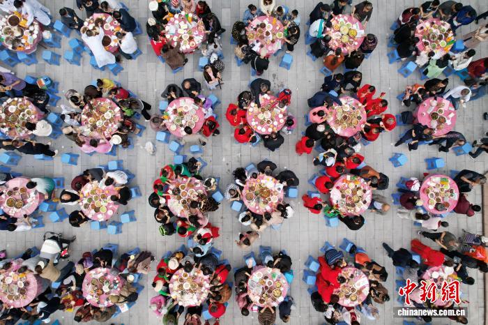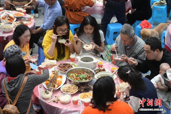 图为百家宴现场,居民围坐品尝美食。陈鑫 摄