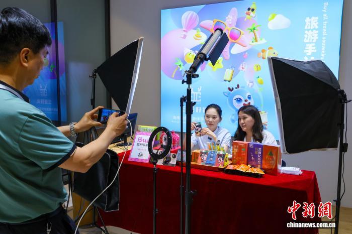 4月17日,在海南三亚德航FLY3跨境(零关税)体验城,主播正在进行跨境直播。中新网记者 骆云飞 摄