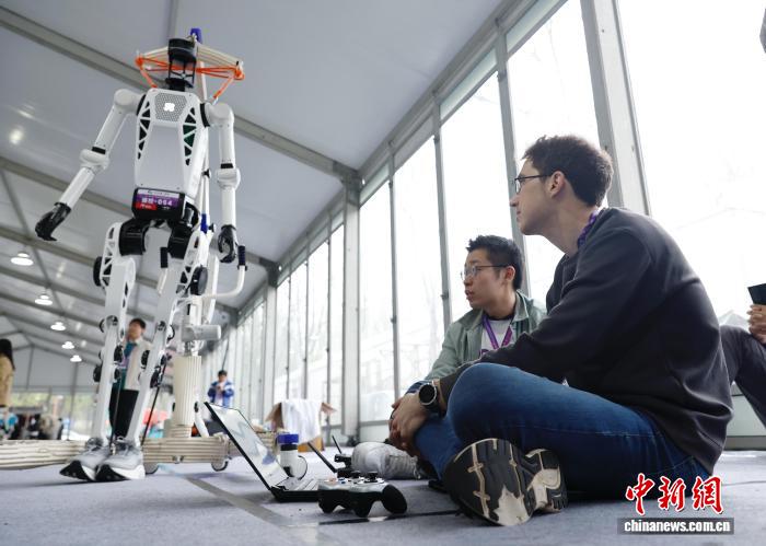 4月16日,工作人员在机器人大本营工作。据悉,2026北京亦庄人形机器人半程马拉松将于4月19日鸣枪开跑。中新社记者 韩海丹 摄