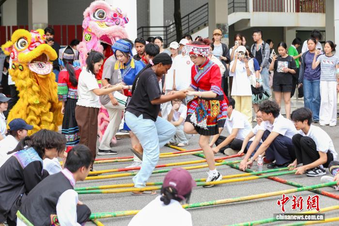 图为南宁职业技术大学学生在跳竹竿舞。南宁职业技术大学 供图