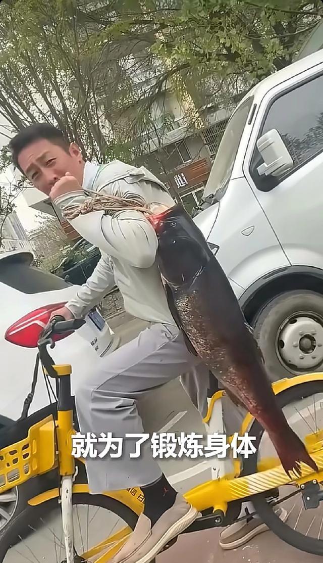 在钓鱼圈这个极度内卷、空军才是常态的环境中,野钓到20斤2两的大青鱼简直不可思议。这相当于一个落选秀在总决赛抢七大战中顶着三个人的防守砍下50分并完成绝杀。他选择骑共享单车展示自己的战利品,而不是打车回家。单车的速度适中,既能保证路人有足够的时间行注目礼,又能最大化地扩大“夺冠游行”的范围。从白天骑到天黑,他甚至特意去饭馆补给碳水。镜头扫过时,他气定神闲,单手扶把,另一只手稳稳托着鱼鳃,肩上的鱼鳞在路灯下闪着金光。他的核心力量和平衡感显然经过了长期训练。