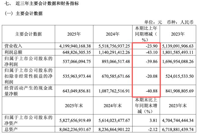 根据中炬高新披露的2025年业绩报告,公司实现营业收入不到42亿元,同比下滑23.9%;实现归属净利润5.37亿元,同比下滑39.86%;实现扣非净利润5.36亿元,同比下滑20.08%;经营活动产生的现金流量金额为6.43亿元,同比下降40.88%。