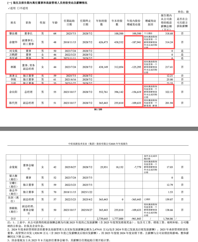 财报显示,新进的董事长倪汝雄在中炬高新获得的税前薪酬总额(为归属2025年度的已发放薪酬(含2025年度预发绩效奖金),包含月工资、绩效工资、福利补贴、公司缴纳的公积金、社保及企业年金。下同)高达318.86万元,比去年该职务的税前薪酬总额高出了50万元以上;而余建华虽然在中炬高新的职务从2024年的董事长,变为了2025年的副董事长、职工董事,但其税前薪酬总额却从2024年的268万元上涨至了2025年的314.24万元,涨幅高达17.25%;公司董事、常务副总经理林颖的税前薪酬总额也从2024年的165.36万元上涨至了2025年的217.41万元,涨幅约23.94%;总经理余向阳的薪酬也从2024年的208.94万元上涨至了322.15万元,涨幅高达35.14%;副总经理陈代坚的薪酬也从2024年的151.89提升至了201.94万元,涨幅约32.95%……
