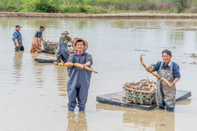 一年等待,张海晖迎来收获:首批25万斤“香粉王”种苗繁育成功,移栽一千亩藕塘,预计可年产280万斤莲藕。
