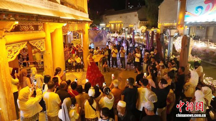 4月中旬,临夏市八坊十三巷内,来自各地的游客欣赏演出、品尝美食。临夏枫临文化旅游投资有限责任公司供图