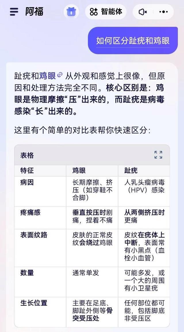 一男子穿着拖鞋走进武汉市第八医院的皮肤科诊室,坐下后脱掉鞋子,指着脚底的一个白色硬块说:“医生,帮我看下这是趾疣还是鸡眼。”接诊的皮肤科主任胡艺先是惊讶,然后好奇地问:“你还知道趾疣?”该男子解释说,他之前用蚂蚁阿福拍照问过症状,AI建议他到医院看看。胡艺稍作检查就确认是趾疣,整个面诊过程不到五分钟。