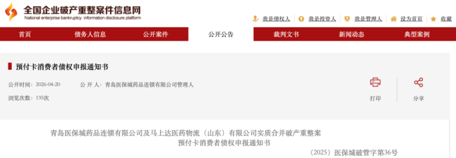 4月20日,全国企业破产重整案件信息网披露青岛医保城药品连锁有限公司(以下简称“医保城”)破产重整最新进展,其中提到3月20日,山东省青岛市崂山区人民法院裁定了其与马上达医药物流(山东)有限公司实质合并重整的申请。