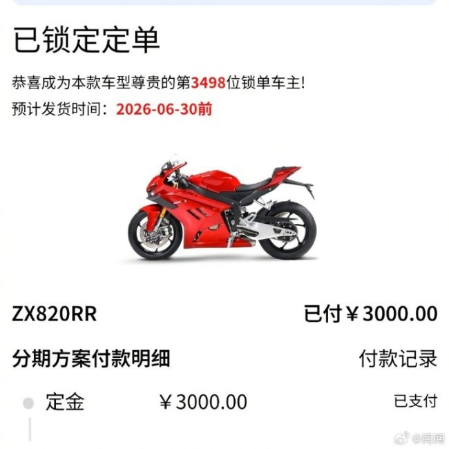 张雪机车在世界超级摩托车锦标赛(WSBK)葡萄牙站历史性斩获双冠后,其冠军同款车型820RR的提车周期成为消费者最关注的话题。目前全国订单普遍排至6月底,最长等待时间接近三个月