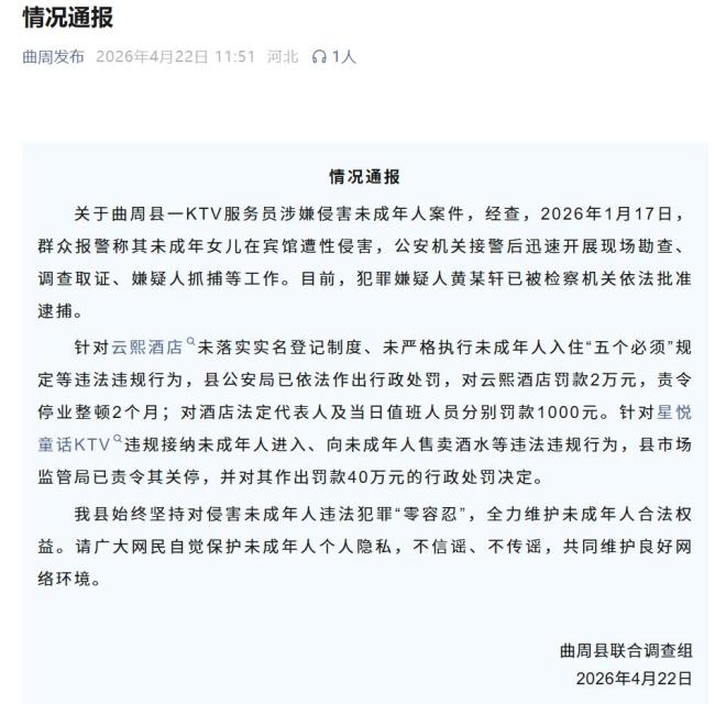 河北曲周县联合调查组4月22日发布情况通报,关于一KTV服务员涉嫌侵害未成年人案件,经调查,2026年1月17日,有群众报警称其未成年女儿在宾馆遭性侵害。公安机关接警后迅速开展现场勘查、调查取证和嫌疑人抓捕等工作
